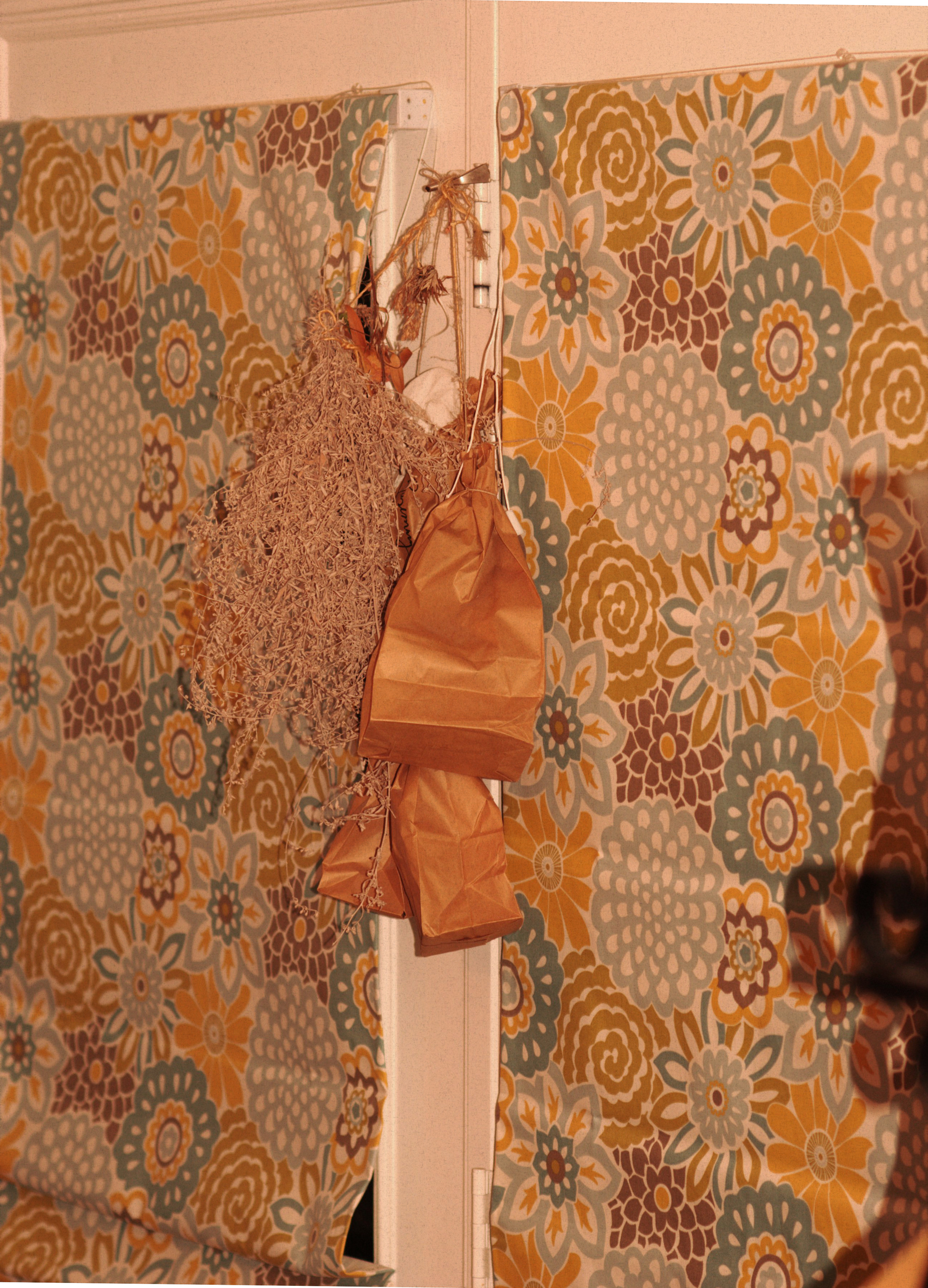 Entrance – Door has salt & red brick dust lines, plus several paper charms wedged in the lintel.