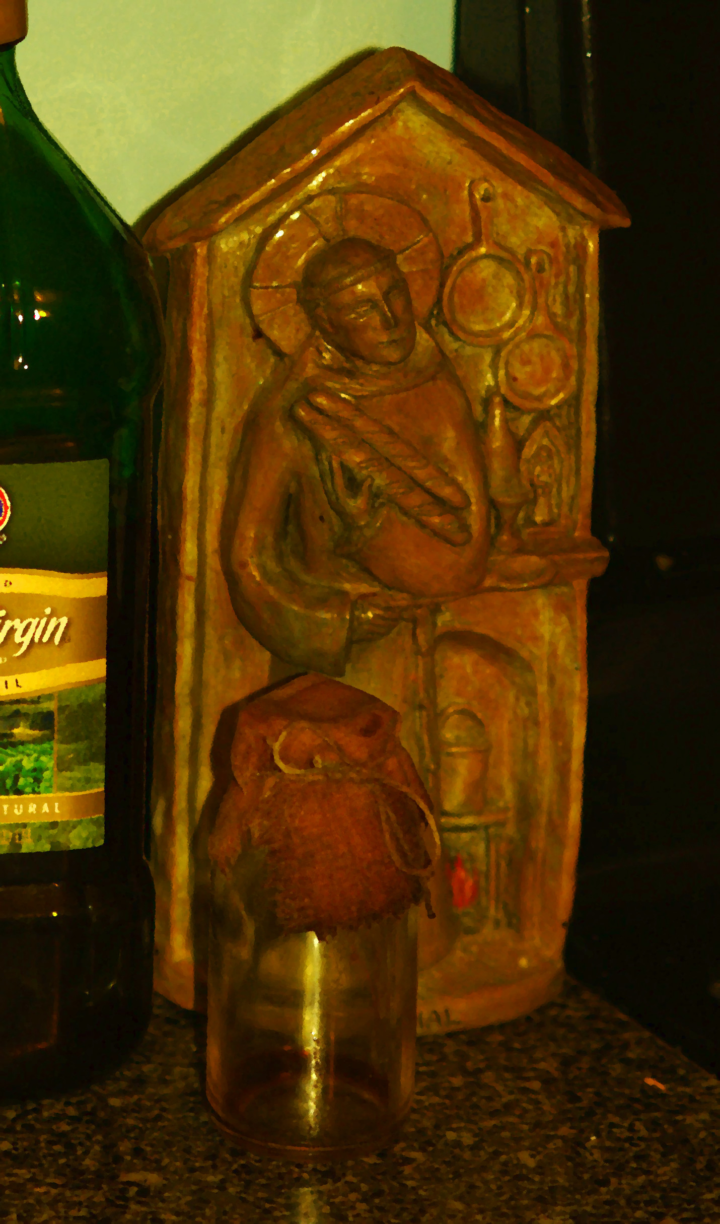 Kitchen – I’ve always got something brewing. Right now I’ve got some tinctures going (some magical, but most multipurpose, used in magic or cocktails equally), a few herbs drying in bags by the windows, and of course, my Four Thieves Vinegar in the pantry (plus a couple of jars of Four Thieves Pickles, which I put up each year). The kitchen is also home to a few of my spirit helpers, including St. Pascal and my resident house spirit (his bottle may look a bit strange, but he’s been with us almost since we moved in, so I don’t mind his scruffy appearance).