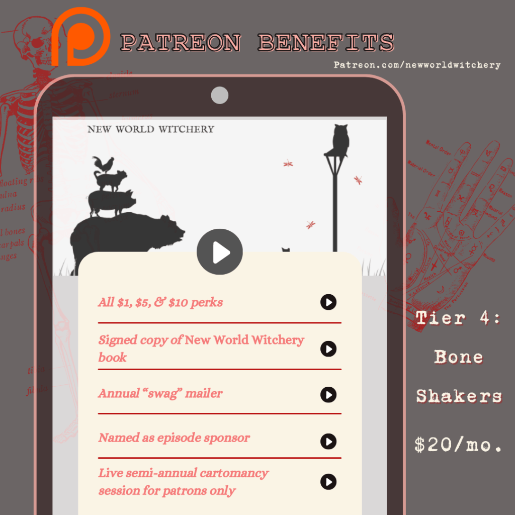Tier 4 (Bone Shakers) – $20/mo. – You’ll get an Annual Swag Mailer (usually a book of some kind, a physical copy of the zine, and a few other little bonus gifts). You also get a signed copy of NWW Book (one time after 6 mos of support). We’ll also be featuring one Bone Shaker as a “Sponsor of the Ep” each month, and if you’ve got a business/podcast/project you’d like us to mention as part of that we’ll be glad to do so (some restrictions apply—no racist or homophobic stuff, for example). PLUS you’ll get access to a Live Zoom Cartomancy session with us twice a year where only patrons are invited and get to ask questions and receive readings!