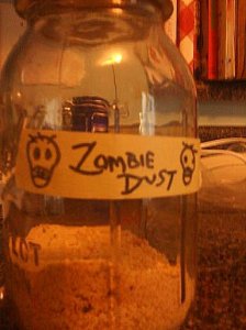 These ingredients, however, may merely be for show, as the key ingredient seems to be moon dust. Moon dust is lunar detritus which falls to the earth after the dozens of meteors which strike the moon’s surface daily send up plumes of the stuff which then make their way to earth. Moon dust can only be collected during a full moon, however, when you can see the little particles making their way down along the silvery beams. The easiest way to collect moon dust (though there really is no “easy” way) is to stand in the light of the full moon with a glass jar held up to catch the falling particles. It takes a good bit of moon dust to make Zombie Powder, so it’s possible you’ll be standing in the dark for quite a while. Just remember that moon dust is very light, so don’t shift the jar at all or it may cause the particles you’ve already captured to float out of the container.